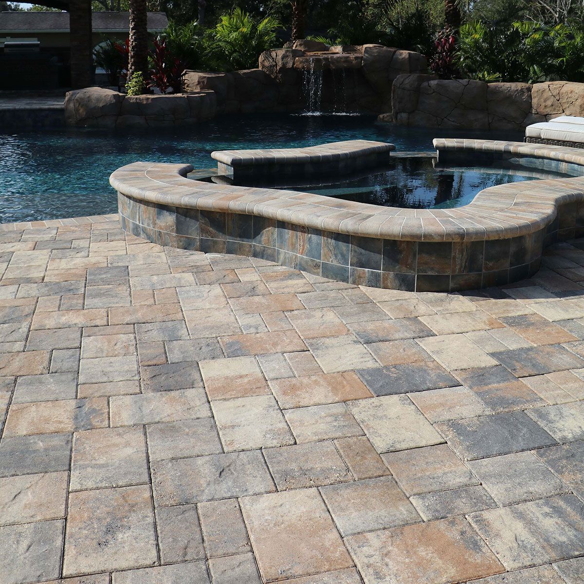 A textured, modular concrete paver system designed for patios, walkways, and residential settings — bringing character and durability to outdoor surfaces.